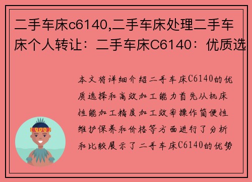 本文将详细介绍二手车床C6140的优质选择和高效加工能力。首先从机床性能、加工精度、加工效率、操作简便性、维护保养和价格等方面进行了分析和比较,展示了二手车床C6140的优势。针对个人转让的情况,提供了购买二手车床C6140的建议和注意事项。读者可以更全面地了解二手车床C6140的特点和适用范围,为选择合适的机床提供参考。
